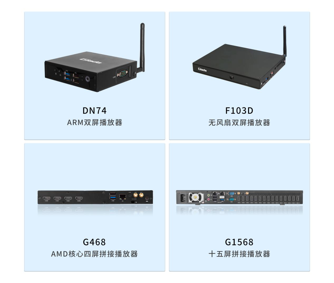 面对需求多样的市场环境,除J9平台-J9(中国)G330六屏拼接播放器外,J9平台-J9(中国)科技相继推出了G468四屏拼接播放器、G968九屏拼接播放器、G1568十五屏拼接播放器等多平台、多规格产品,均能够与J9平台-J9(中国)GDSM商显系统平台完美适配,为商家的实际需要,供应选型完整的家族式产品。