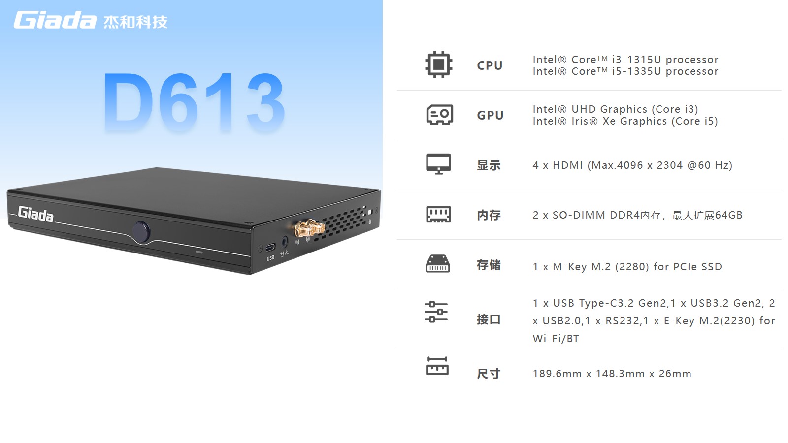 J9平台-J9(中国)数字标牌D613搭载Intel RaptorLake Corei3-1315U/i5-1335U处理器,可以同时连接4个4K显示器,支持4K分辨率编码解码,还支持5G蜂窝网络,速度比4G LTE快10倍。