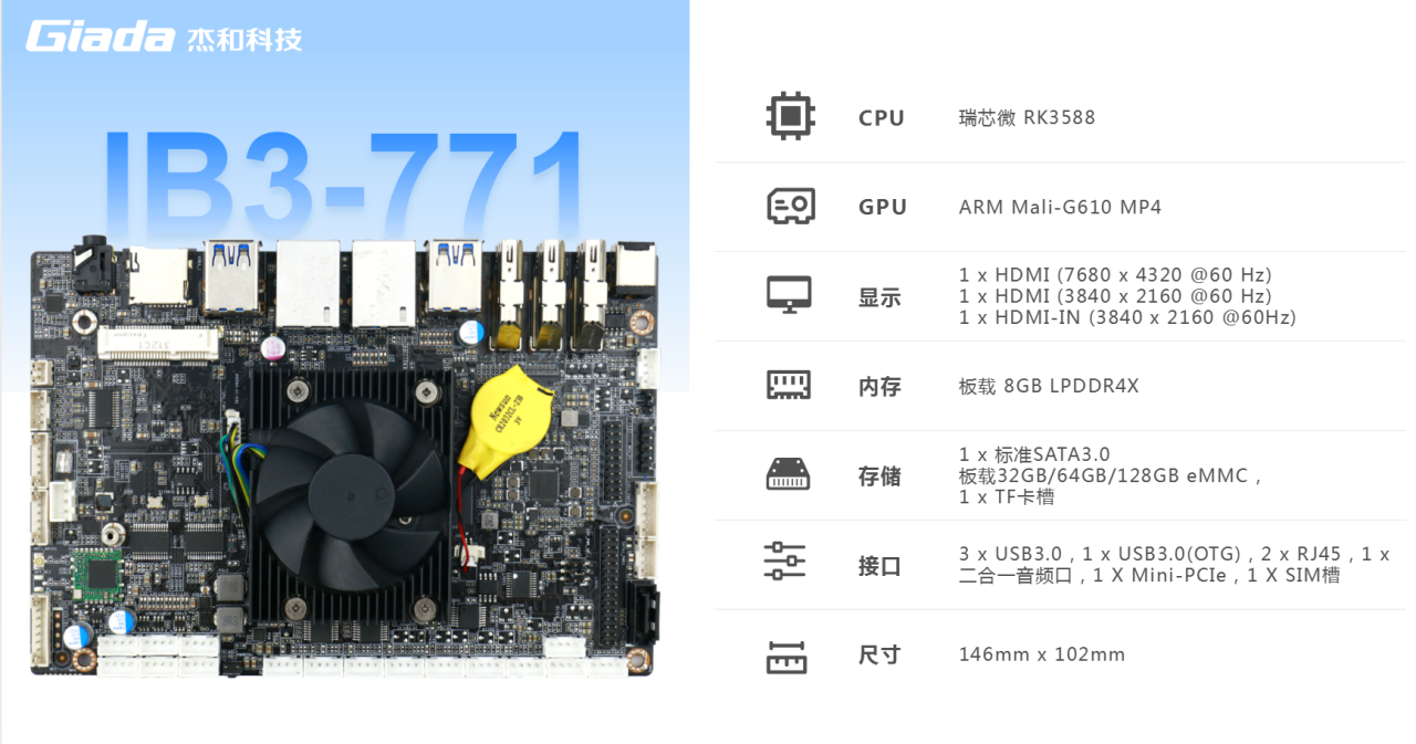 J9平台-J9(中国)主板IB3-771搭载瑞芯微RK3588八核64位处理器,内置6TOPS算力的NPU,具备高算力、内存大、超强多媒体、多重扩展等技术优势。满足8k超高清视频的显示需求,还支持主流深度学习框架,为各类 AIOT 应用场景提供更优的性能表现,支持机器人、边缘计算、智能NVR、智能汽车、智慧大屏、AR/VR、智能自助终端场景的广泛应用。