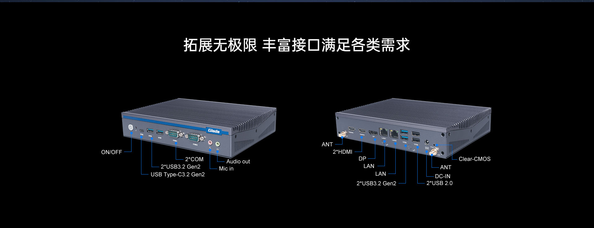 支持2 x HDMI,1 x DP,最高支持8K视频输出